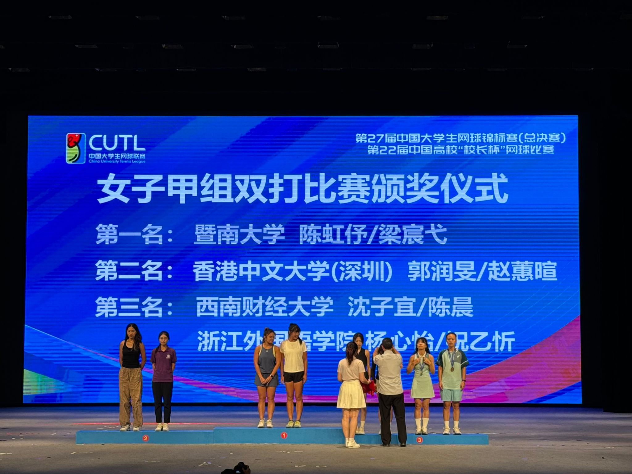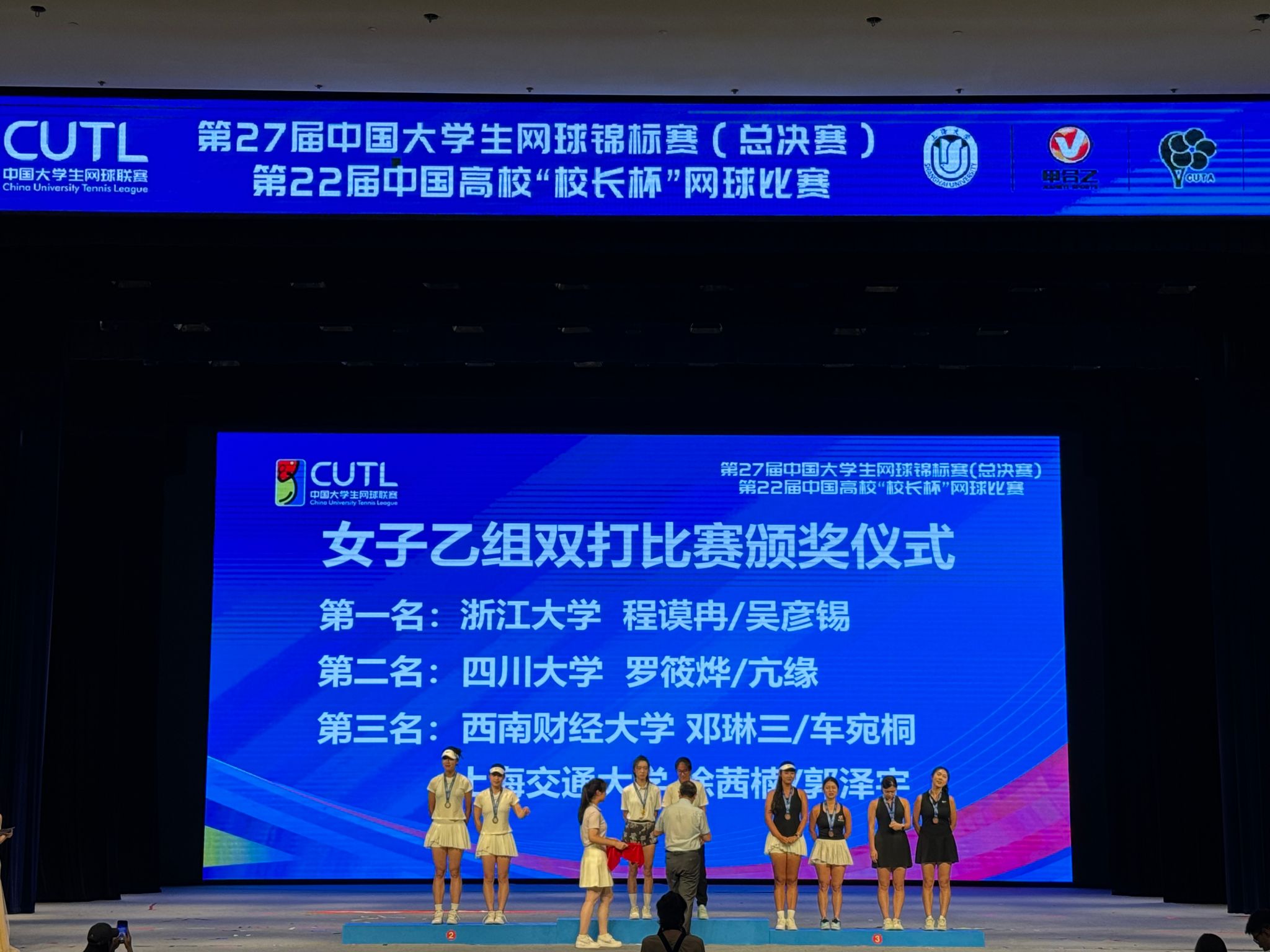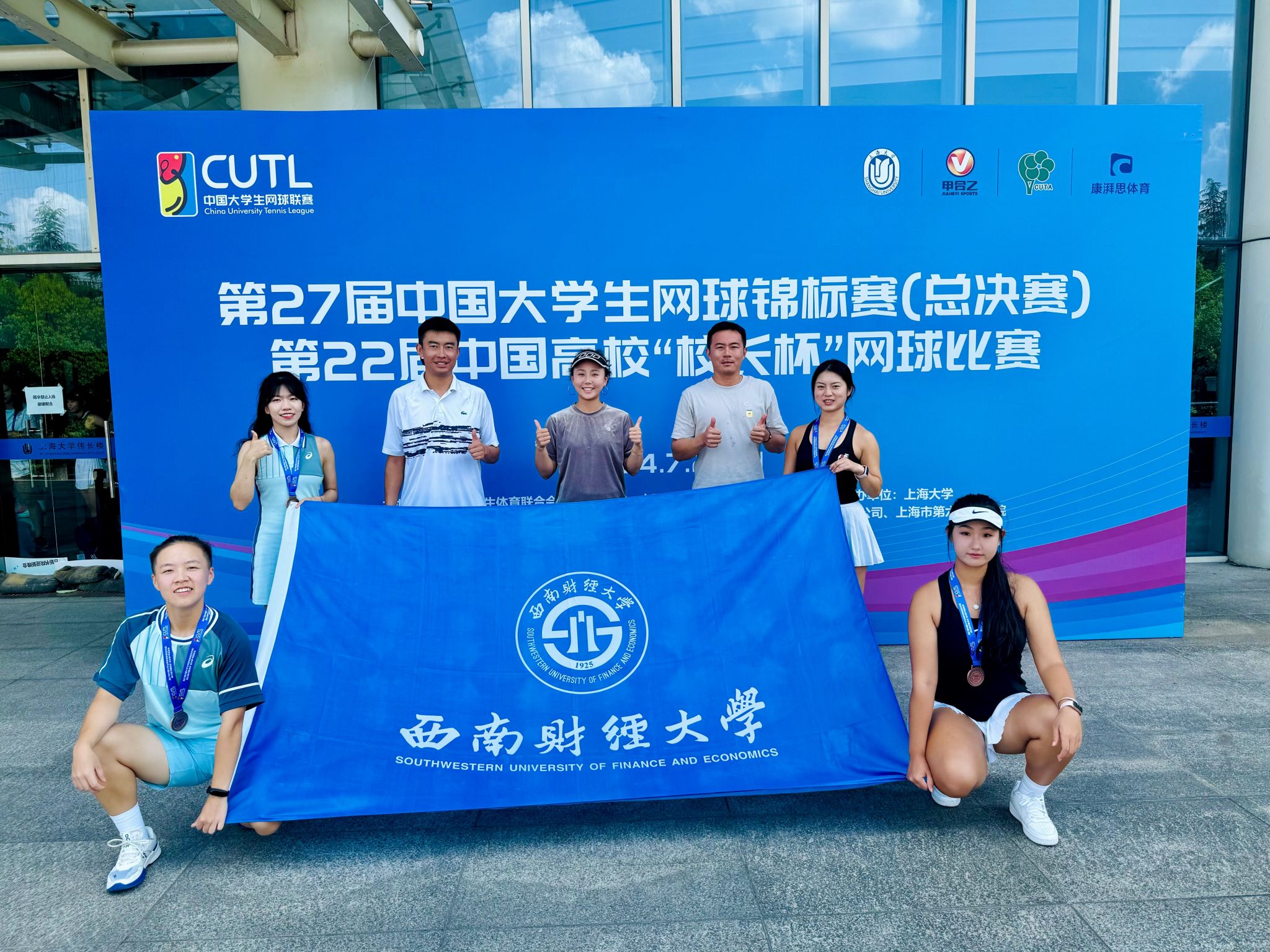 7月22日-8月1日,第27届中国大学生网球锦标赛(总决赛)在上海大学(宝山校区)举行。中国大学生网球锦标赛是我国大学生层面最顶级的网球赛事,经过八大分区赛的激烈角逐,在本届中国大学生网球锦标赛(总决赛)中,共有来自全国132所高校的915名同学成功晋级总决赛。参赛规模创历史新高!乐动(中国)网球队在前期分区赛上表现突出,成功晋级总决赛,11名运动员代表学校参赛,孙巨杉、施泓宇、孔星宇担任教练。经过八天的激烈角逐,西财健儿们在强手如林的赛场上顽强拼搏,团结奋进,获得女子普通高校甲组双打季军和女子高水平乙组双打季军的好成绩,充分展现了西财学子的精神风貌和青春风采,为即将到来的西财百年华诞献礼!
