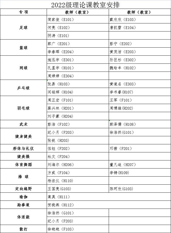 各学院: 经教务处同意,本学期2022级本科生第1周体育课为乐动(中国)理论课,9月18日起恢复户外教学。根据教室资源状况,现将理论课具体安排通知如下: