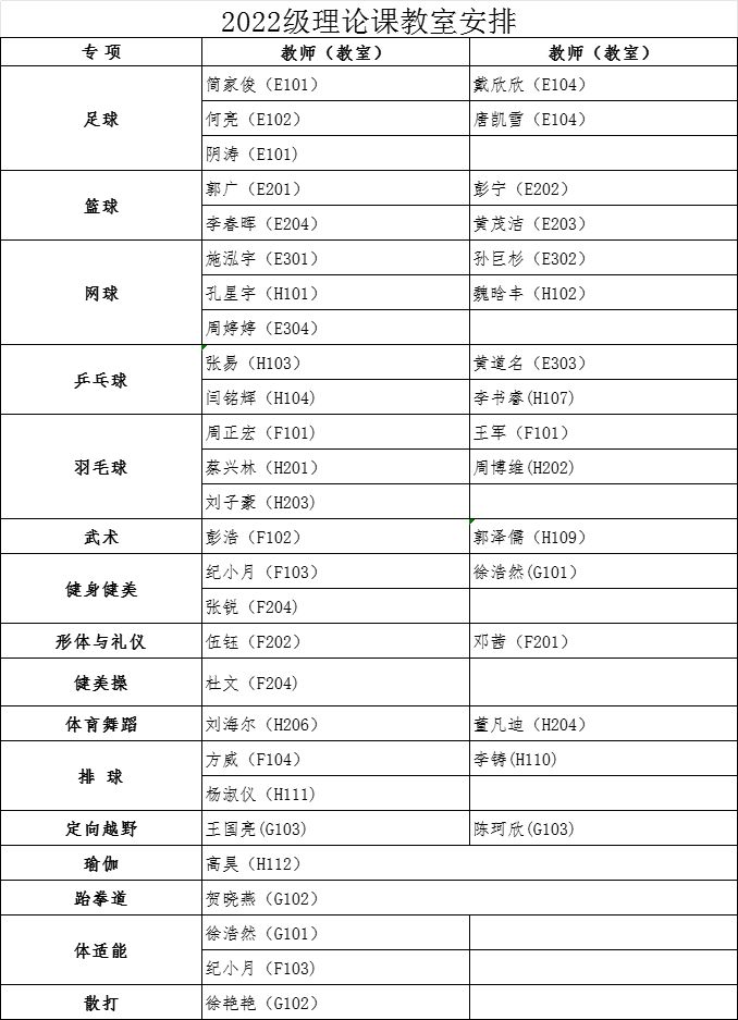 经教务处同意,本学期2022级、2023级本科生第1周体育课为乐动(中国)理论课,3月4日起恢复户外教学。根据教室资源状况,现将理论课具体安排通知如下: