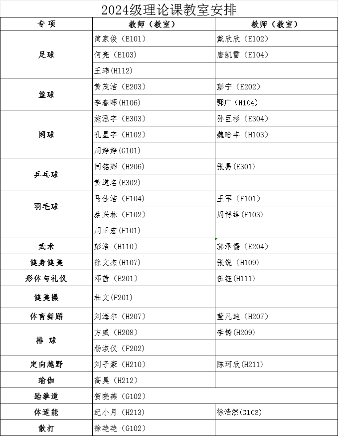 经教务处同意,本学期2024级本科生第3周体育课为乐动(中国)理论课,9月29日起恢复户外教学。根据教室资源状况,现将理论课具体安排通知如下: