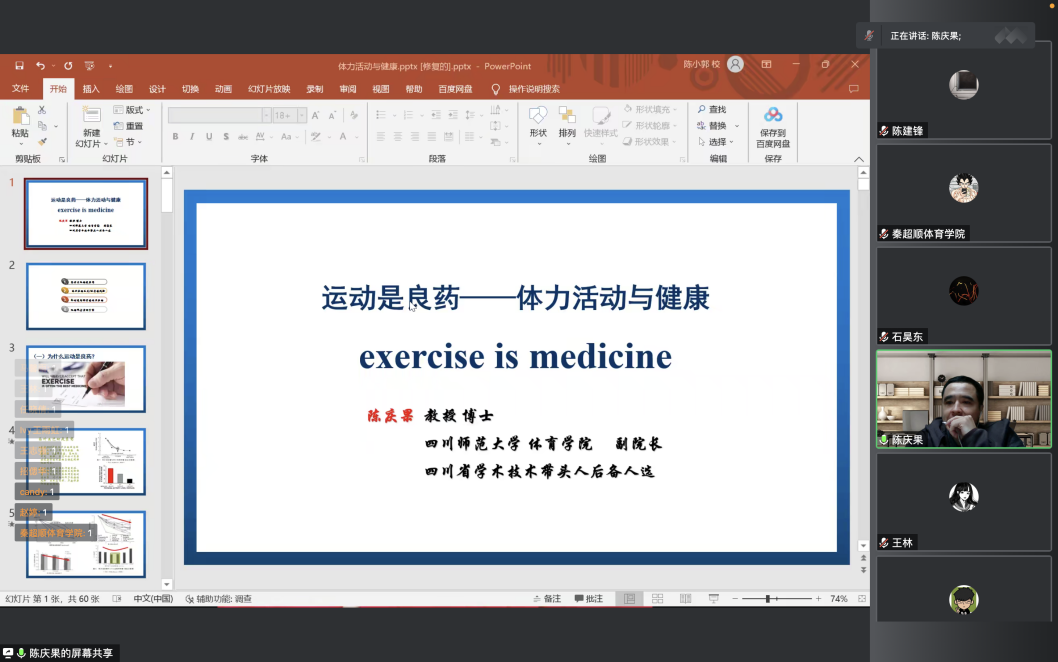 2022年11月10日,四川师范大学乐动手机平台副院长陈庆果教授在线上举办了题为《再谈运动与健康:运动是良医》的光华讲坛,乐动手机平台副院长陈丛刊主持本次讲座,乐动手机平台研究生、部分教师以及校内外师生等共计60余人参加了此次讲座。
